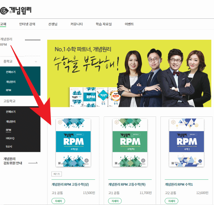 홈페이지에 접속 후 상단 카테고리에서 [교재]를 선택합니다. 순차적으로 [RPM] 항목을 클릭합니다.