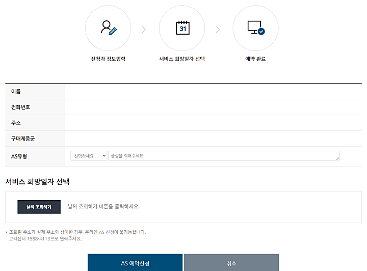 고객번호 확인 후 고객번호를 조회합니다. 이후 신청자 정보 입력, 서비스 희망일자를 선택한 후 AS 예약 신청을 합니다.