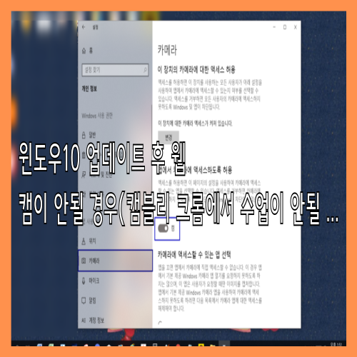 이런 경우 [윈도우 시작 버튼 > 설정 > 개인 정보 > 카메라]를 순차적으로 선택합니다. 카메라 설정에서 '앱에서 카메라에 액세스하도록 허용'을 켬으로 바꿔주시기 바랍니다. 만약 켬으로 설정이 안되있다면 앱에서 카메라 액세스가 불가능합니다.
