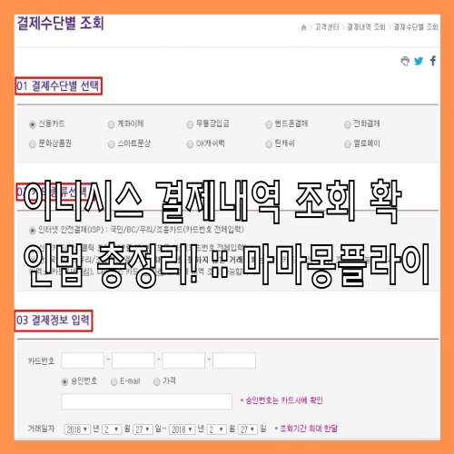 홈페이지에 접속하면 화면 중앙에 위치한 '결제 이력 조회'의 범주를 클릭하고, 검색하려는 결제 수단을 선택해 결제 수단에 대한 정보를 입력합니다. 신용카드를 선택하면 결제일과 카드번호를 입력해야 합니다.