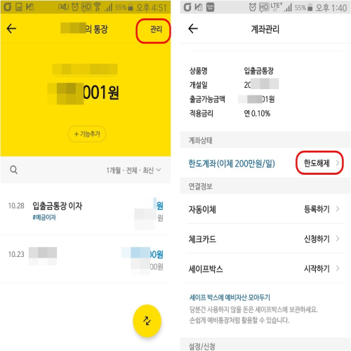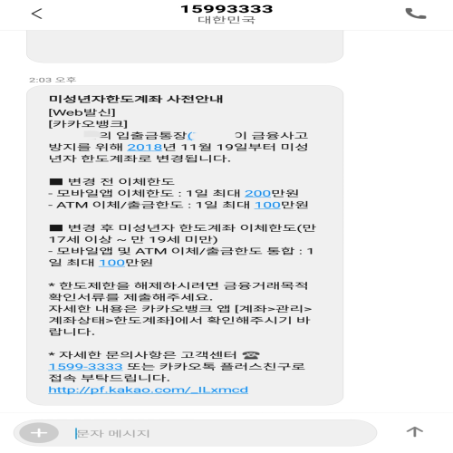 카카오뱅크 한도/이체한도/이체한도/이체한도/카카오 뱅크 앱에서 이체한도 1일/1일 200만 원, 카카오 뱅크 앱에서 이체한도:ATM 이체 및 이체한도 1일 1회 미성년자는 모바일 앱의 전송 한도와 자동화기기의 전송/전달 한도를 합산해 하루 최대 100만 원까지 지원합니다. 만 19세 미만 미성년자가 카카오 뱅크 입출금 통장을 개설할 경우 금융사고를 예방하기 위해 '미성년자 한도 계좌'로 개설됩니다.