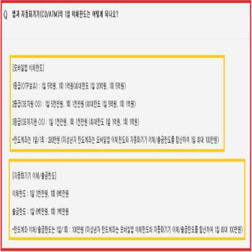 하루 1억 원, 1억 원까지 송금이 허용됩니다. SE 지원 OS? 스마트 폰이 보안을 위한 안정된 저장소 역할을 하는 하드웨어 기반 보안 칩(SE) 세큐어 얼리티를 지원하는 OS를 가리키는 카카오 뱅크 ATM이체 한도는 1일 3천만원, 1회 600만원, 1회 600만원, 1회 600만원까지 지원됩니다. • 전환 제한 제한이 있습니까? 변경 제한이 없습니다.전달 제한이 있습니까? 카카오뱅크 앱의 전송 제한이 감소되었습니다. 어떻게 된 거죠? 사고 신고, OTP 사용 해제 및 폐지, 사용 중인 스마트폰이 SE 지원 장치에서 SE 미 지원으로 변경되면 감면받을 수 있습니다.