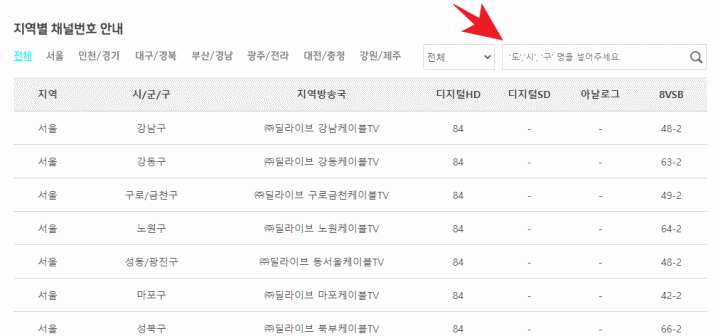 같은 지역이라도 이렇게 채널번호가 다르기 때문에 여러분이 계신 환경에 따라 확인이 필요합니다. 단, 아래의 방송 서비스를 사용한다면 지역에 상관없이 채널번호는 동일합니다.