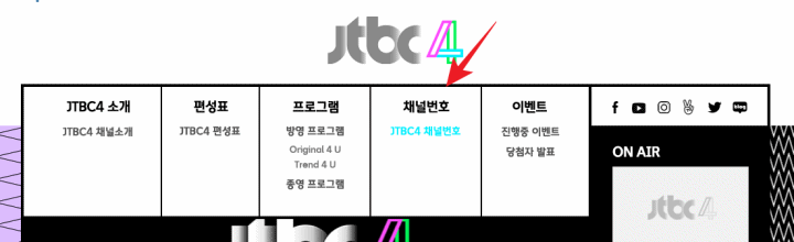 홈페이지에 접속하면 상위 메뉴에서 [채널번호 > JTBC4 채널번호]로 순차적으로 이동합니다.