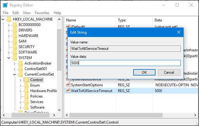 3. WaitTokillServiceTimeout 값을 5000에서 100으로 변경합니다.